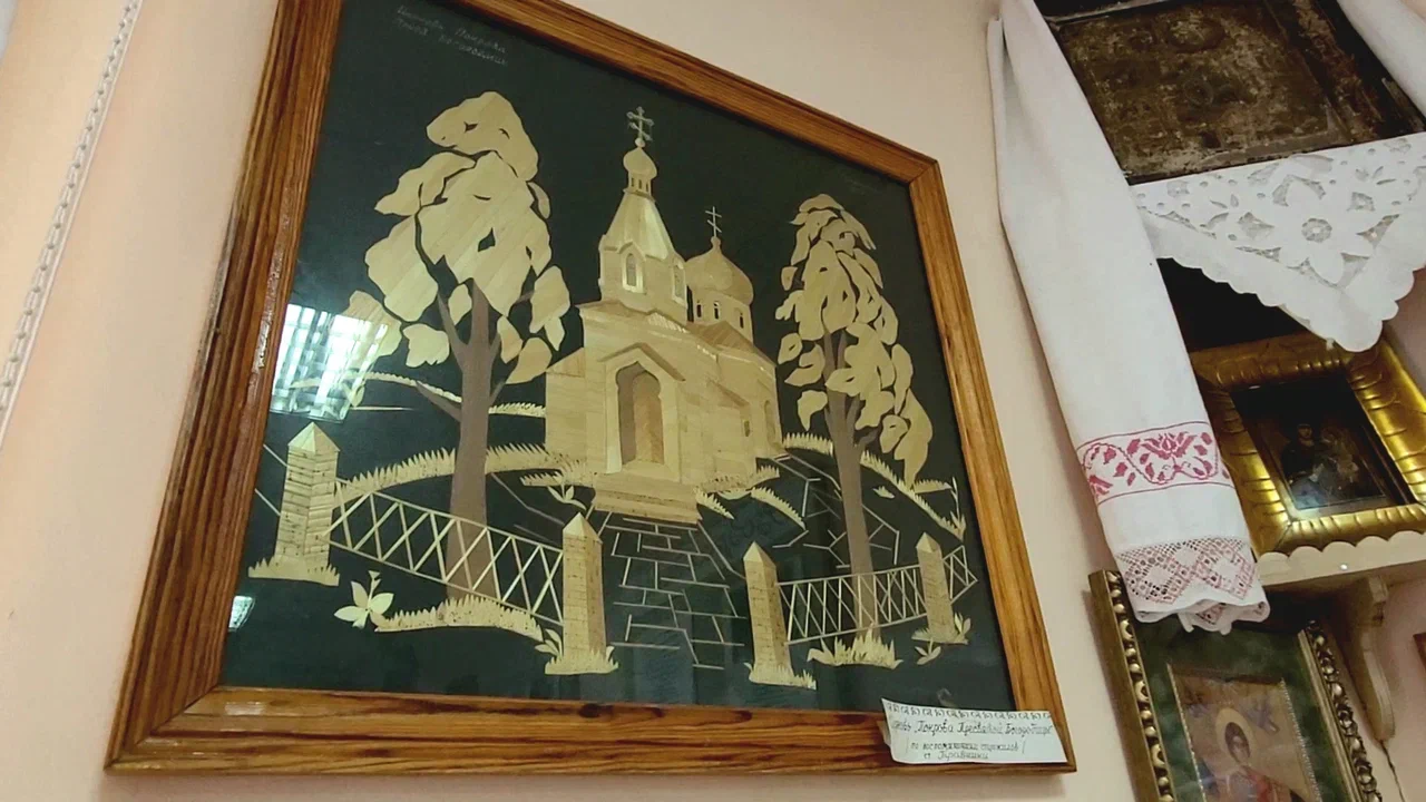 Наталья Александровна снимает со стены картину из соломки. Это церковь Покрова Пресвятой Богородицы. Она была построена в 1910 году. Позже ее снесли большевики. Сейчас на этом месте установлен поклонный крест. Местные жители собирают деньги на строительство храма. В 2024 году митрополит Челябинский и Миасский Алексий подписал проект возведения церкви.