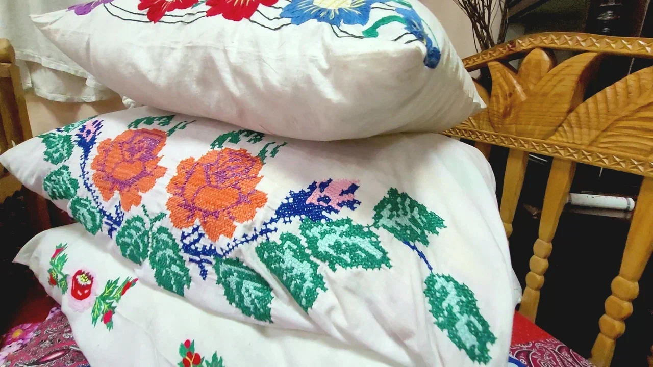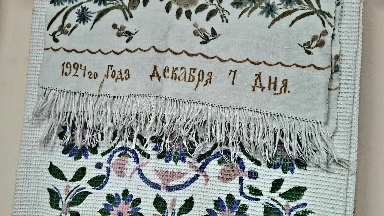 На стене развешены рушники и полотенца. Яркие, самобытные. На них изображены птицы, символизирующие мир, добро, богатство. На одном из полотенец вышито «1924 года декабря 7 дня».