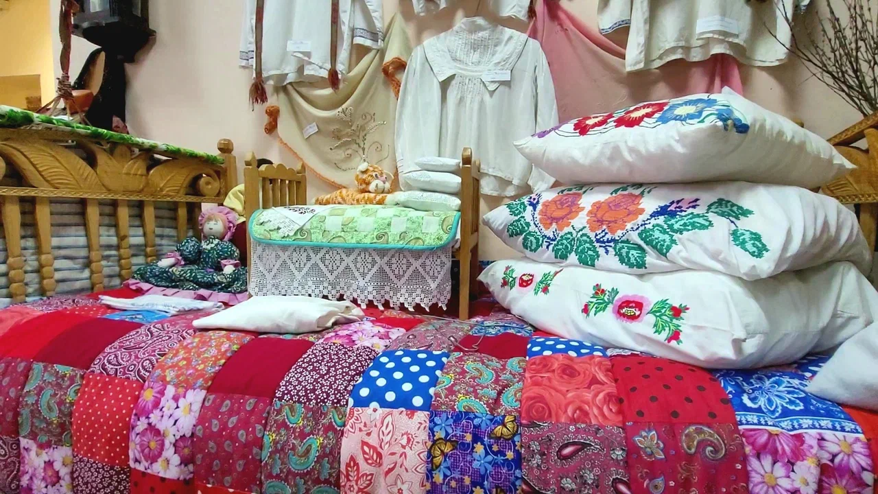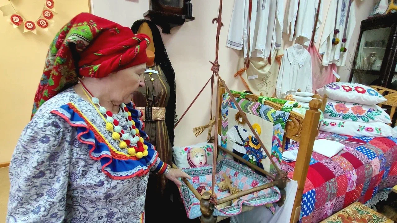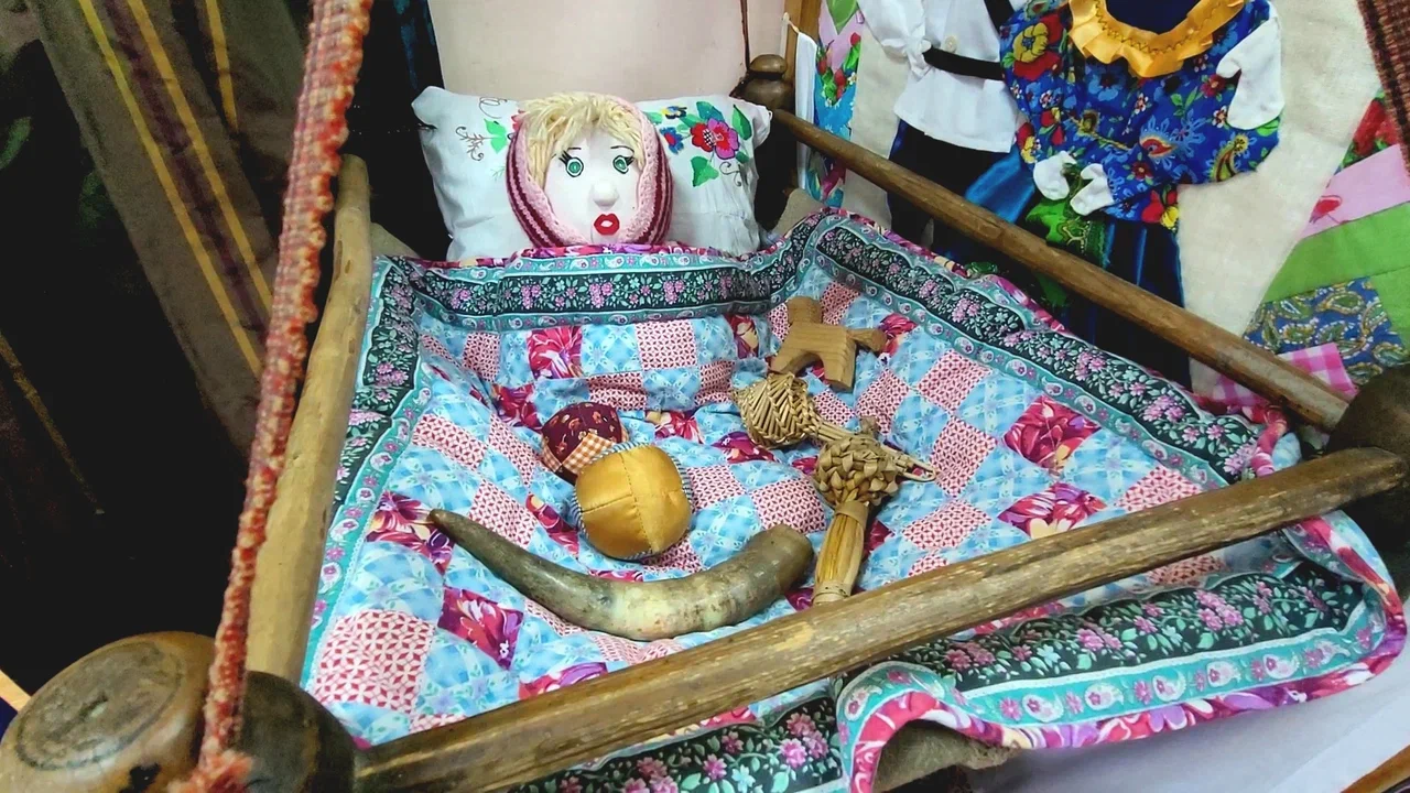 На кровати разложены вышитые подушки, лоскутные одеяла. Рядом – люлька, а в ней – погремушки, наполненные сушеным горохом, шаркунок из бересты, деревянный конь. Наши предки считали, что звон отгоняет нечистую силу от младенца.