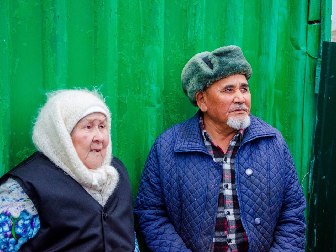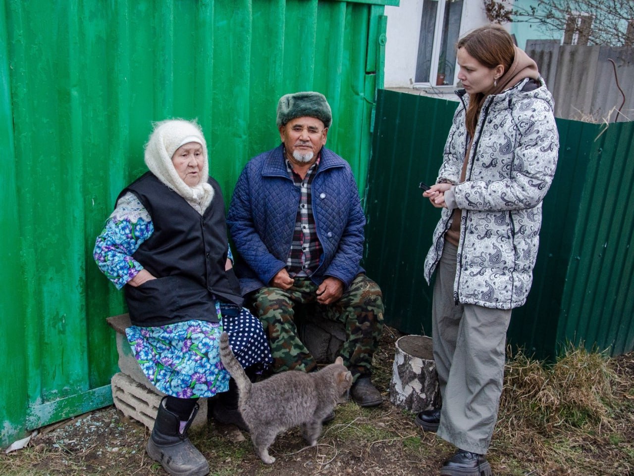 Во дворе появляется приятная пожилая женщина в традиционном камзоле и белом пуховом платке. Удивляется, что кто-то до них доехал и зовет побеседовать мужа, предупредив правда, что он не местный, а приезжий (как выяснилось позже – приехал в поселок из Казахстана он более 70 лет назад!).