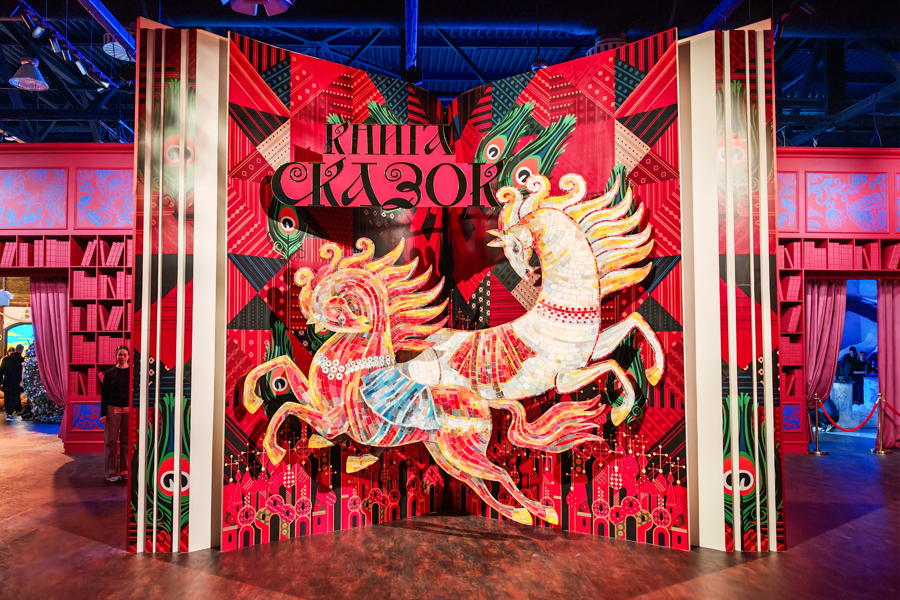 Чудеса начинаются в Библиотеке-сокровищнице жар-птицы — пространстве, где бережно собраны ремесленные изделия и уникальные предметы из разных регионов России. Это ее волшебная кладовая, открывающая путь к зимней сказке. Следуя за сияющим пером жар-птицы — символом света, надежды и исполнения желаний, гости откроют пространство, где легенды оживают, а каждая страница книги превращается в путешествие по этническим зимним сказаниям.