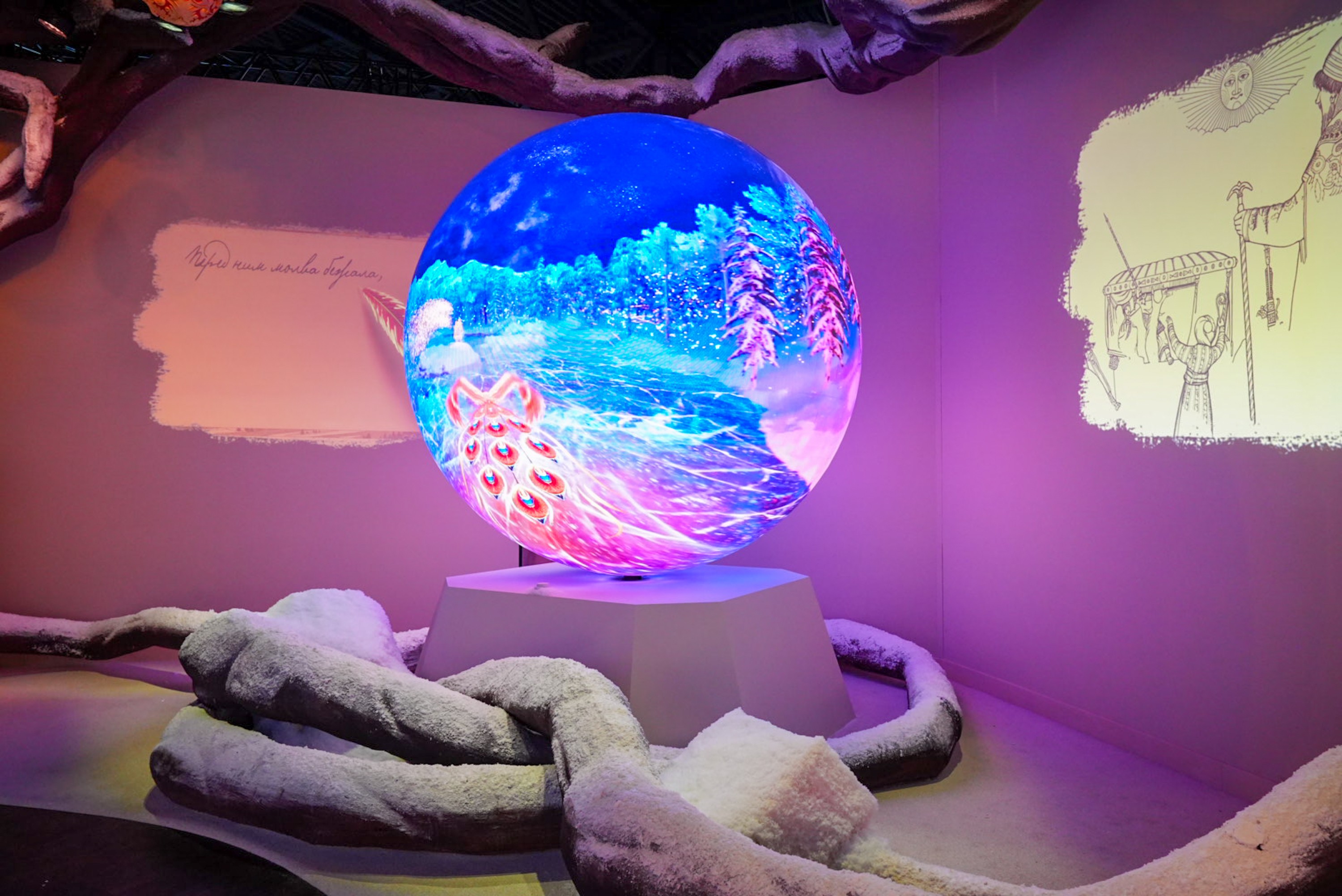 Дальше дорога ведет в хрустально-зимний лес, где восемь регионов России раскрывают свои сказания. В центре леса гостей ждет интерактивное путешествие: можно вылепить Снегурочку по давнему обычаю, пройти испытания дремучего леса, спросить дорогу у мудрой русской печи, а затем построить свой сказочный град на острове Буяне — как в пушкинской традиции.
