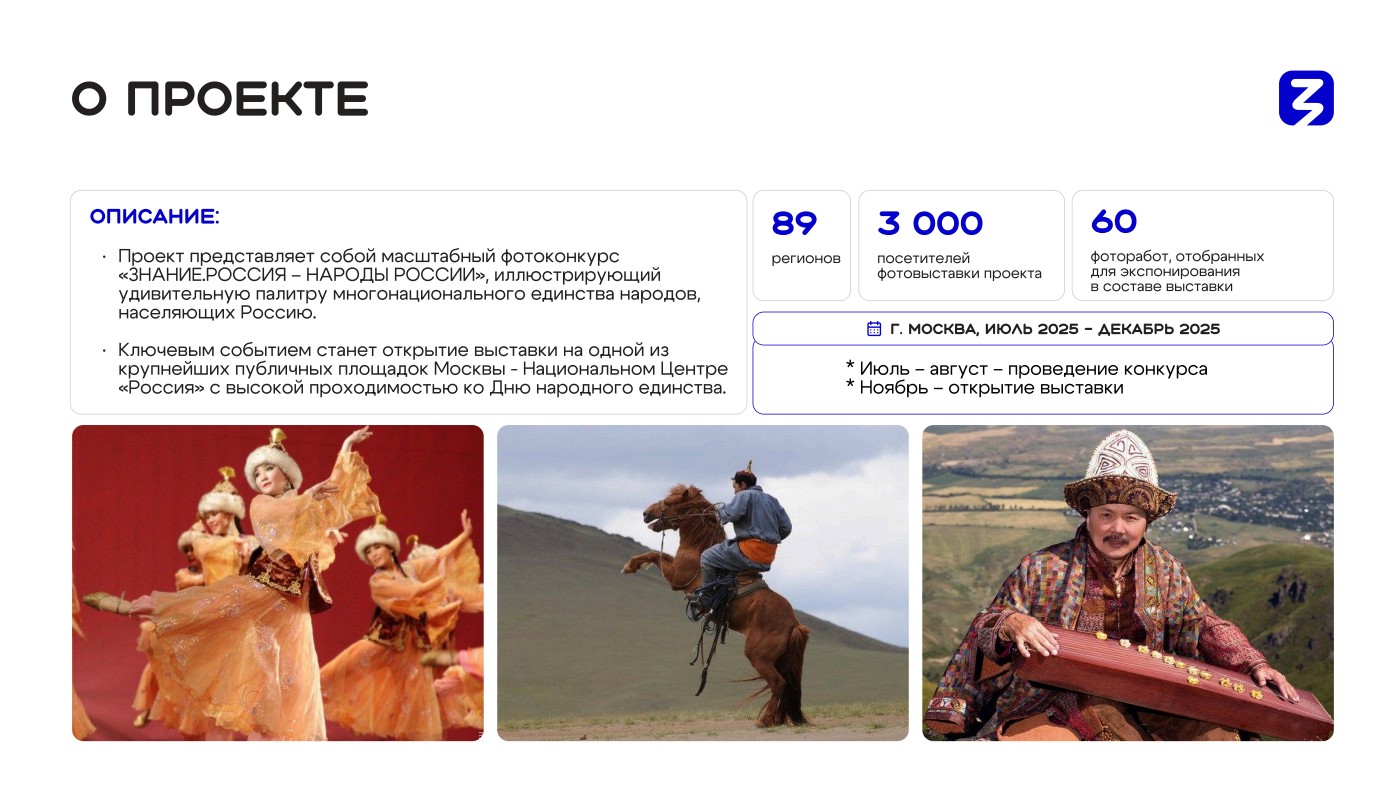 А в июле открылся прием работ на совместный с обществом "Знание" фотоконкурс "Знание.Россия – Народы России". На конкурс поступили работы из 89 регионов нашей страны. 60 лучших фоторабот по четырем номинациям ("Дети России", "Национальные танцы", "Национальные свадьбы", "Самобытная Россия: предметы и пейзажи") составили экспозицию, которая открылась 3 ноября в Национальном Центре "Россия".