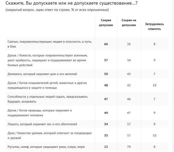 Больше всего надежды у россиян на святых, покровительствующих людям в опасности, в пути и в бою (66%), а также на духов и божеств, которые дают храбрость, защищают и поддерживают во время боевых действий (57%).