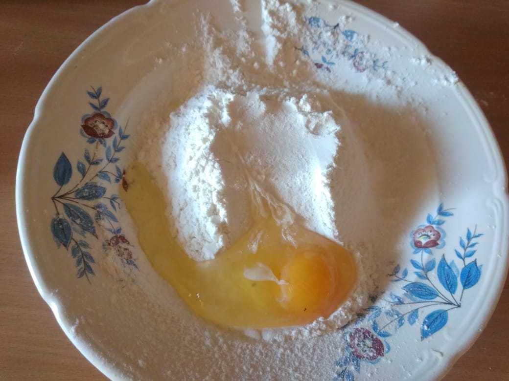 Муку просеять горкой, наверху сделать выемку, в нее разбить яйцо, добавить растительное масло и, постепенно подливая воду, вымесить тесто.