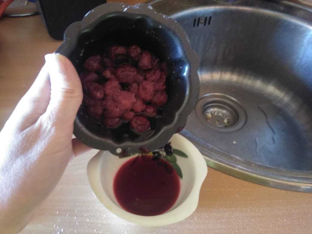 Если вишня свежая - удалить косточки. Ягоду высыпать в миску и засыпать сахарным песком. Через час слить сок в отдельную емкость.