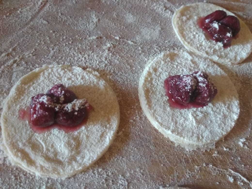 На каждый кружочек положить 2-3 ягоды, слегка посыпать мукой. Залепить края вареников, так, чтобы получился полумесяц.