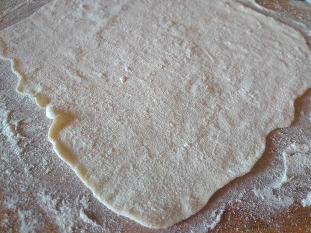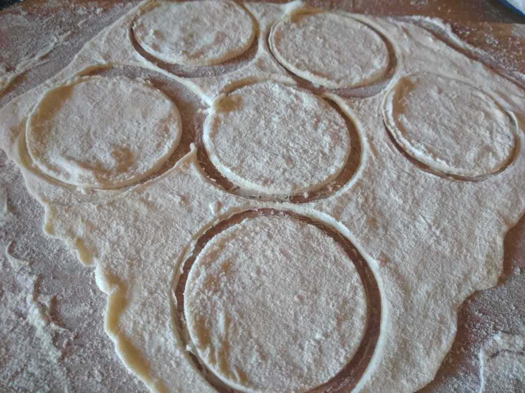 Раскатать тесто в очень тонкий пласт. С помощью стакана вырезать из него кружочки.
