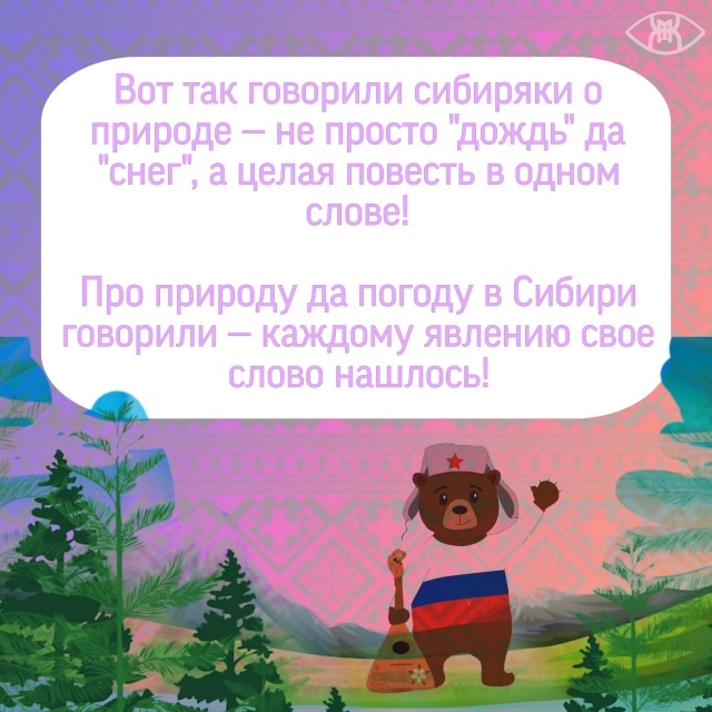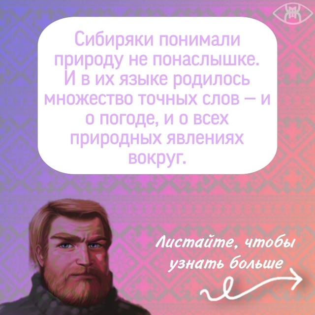 Наши предки подарили нам уникальный язык, где у каждого ветра, мороза и оттепели есть свое имя. Хотите узнать, чем «дубак» отличается от «колотуна» и что такое «плюхан»? Смотрите карточки Анны Миронец и погрузитесь в богатейший мир сибирской речи!