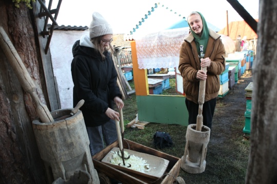 А у него настоящий чувашский музей утвари: старинный замок-запор, кувшины и кринки, лопаты, даже жернова для помола. Травяные и деревянные куклы-обереги смотрят на нас с полок, качаются в старинной люльке, и шуршит ветерок в их волосах. Птички щебечут, куры снуют по участку и пес Мухтар цепь трясет при входе. А нам печка огоньком горит и теплом манит. В печке, в пламени, на лопате сами блинчики жарятся, гостевые, чувашские. Добрые хозяева накормили гостей-студентов, рассказали о традициях, иван-чай с мелиссой разлили и мед с маслом после свадьбы достали. Хорошо, тепло и вкусно... И потекла беседа неспешная, пока отъезжать не пришлось.