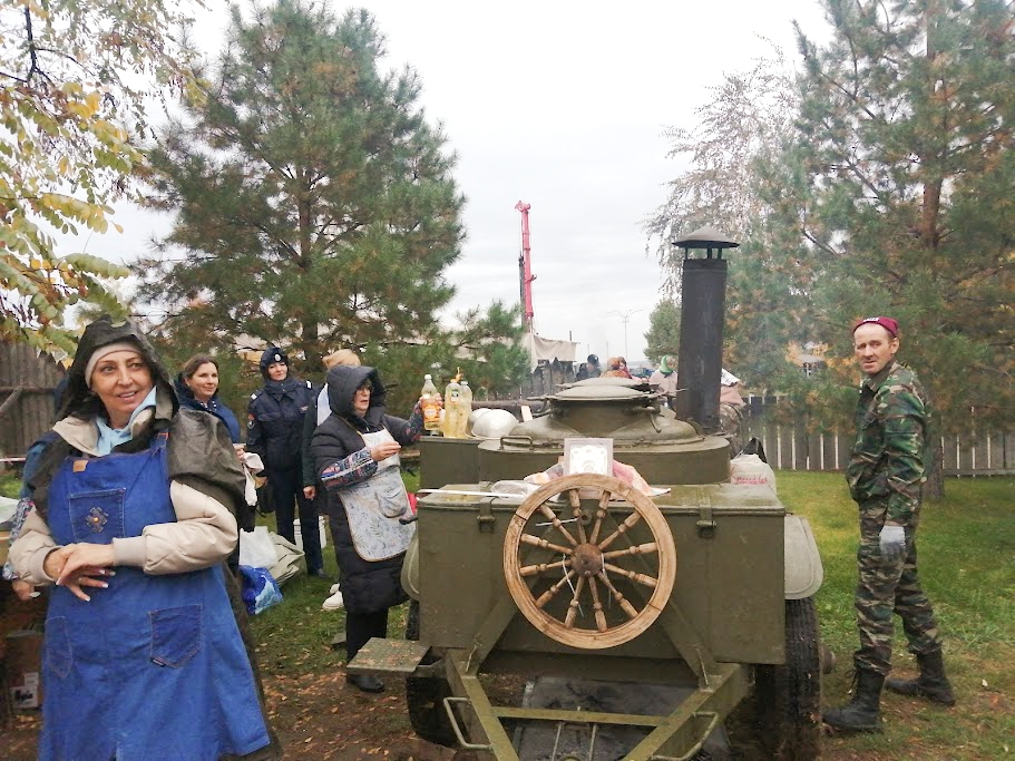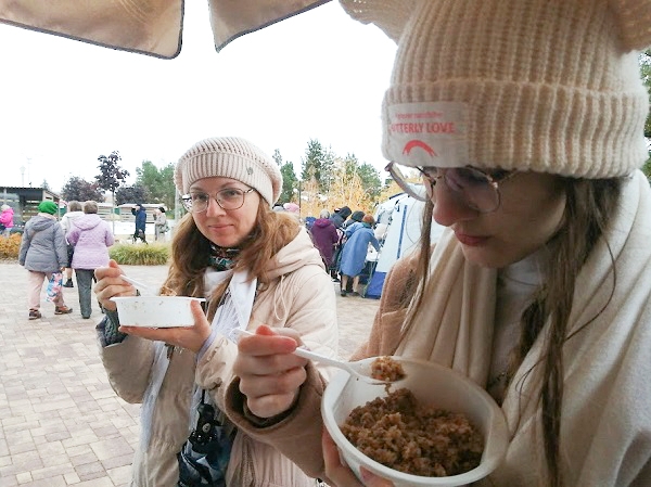 В обеденное время гостей пригласили попробовать казачью кашу. На раздатке нам рассказали об основных ингредиентах: гречка, тушёнка, морковь, лук, укроп. И тут у нас возник вопрос. Мы знали, что казачья каша – это кулеш. Основой блюда является пшено, но гречка?.. Впрочем, обед оказался горячим, сытным и вкусным. Конечно, ведь готовили его на наших глазах!
