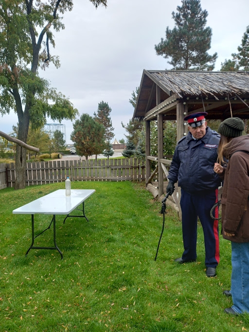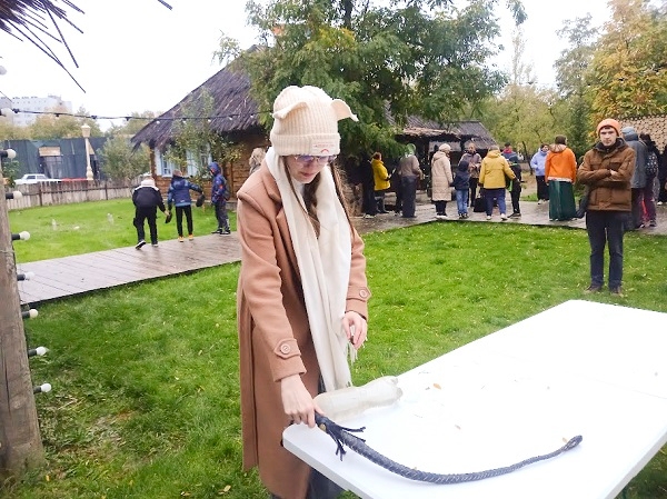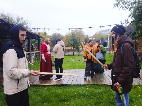 Нам дали примерить роль казака: вложили в ладонь рукоять нагайки. Кожаная оплётка была прохладной и удивительно живой на ощупь. Задание заключалось в том, чтобы сбить шишку с крышки бутылки на столе. Нас направляли по хвату, постановке рук и корпуса. Однако удавалось справиться с гибким и хлёстким оружием не всем: кто-то смог попасть в цель, а кто-то постоянно промахивался и ронял бутылку с водой на землю.