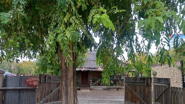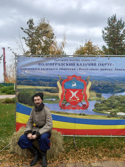Казалось, мы уже всё увидели. Но, обойдя главное подворье, мы обнаружили целый мир за его забором. Здесь дымился самовар и пахло костром. Около баннера Волгоградского казачьего округа так привлекательно стоял тюк сена, что мы попросили одного из участников ансамбля сесть на него и сфотографировали.