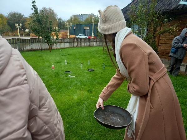Но вот командный дух сменился азартом личного соревнования. Рядом гостей уже звали проверить себя на меткость: все желающие пробовали попасть сковородами в бутылки, чтобы сбить их. Взрослые помогали ещё совсем маленьким, а потом играли самостоятельно. У всех было неограниченное количество попыток.