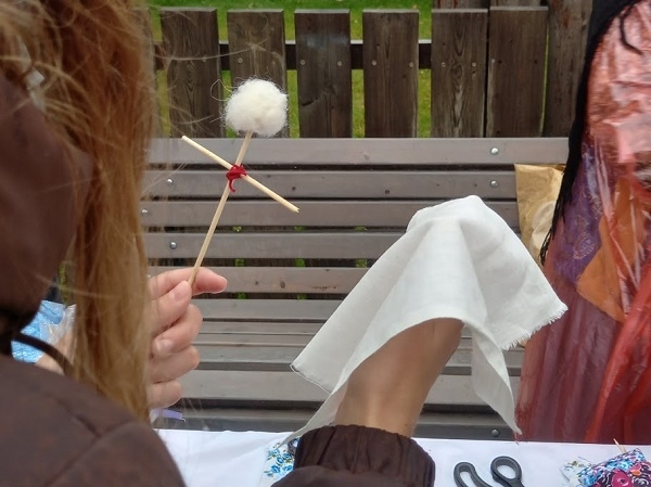 Здесь на мастер-класс по созданию народной игрушки выстроилась целая очередь не только из детей, но и из взрослых. Начинали с крестообразной основы и ватного шарика – головы.