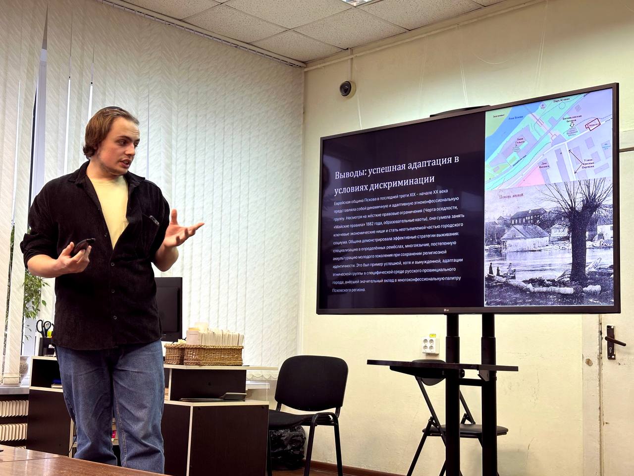 Занятие закончилось лекцией магистранта истфака ПсковГУ Константина Караичева о том, как в Псковской области появилось еврейское население и как менялись численность, род занятий и образованность псковских иудеев в зависимости от политики государства и исторических событий.