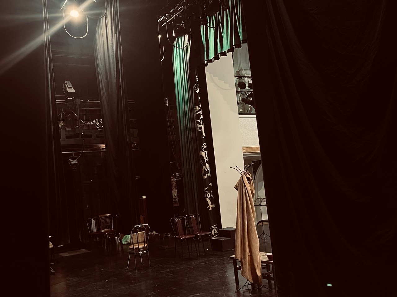 День начинается не с поднятия занавеса, а с голосов в пустом зале. В десять утра на сцене - репетиция. Актеры - в повседневной одежде, сценарий - в руках, звукорежиссер и светооператор создают атмосферу на сцене.
