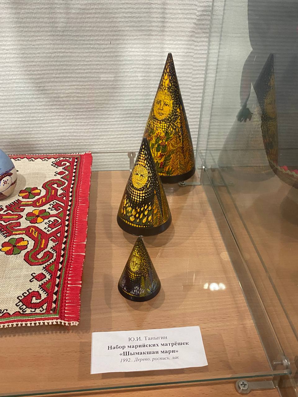 Рядом затаились загадочные духи - «Пампалче» и «Водыш». Чуть поодаль замер в гордой позе «Горный баран». Но дальше нас ждал самый неожиданный сюрприз. На отдельной витрине выставлен набор матрешек «Шымакшан мари» Юрия Таныгина. Помимо привычных нам красавиц, мы увидели редкий экземпляр - конусные матрешки. Они уникальны, их всего три в музее!