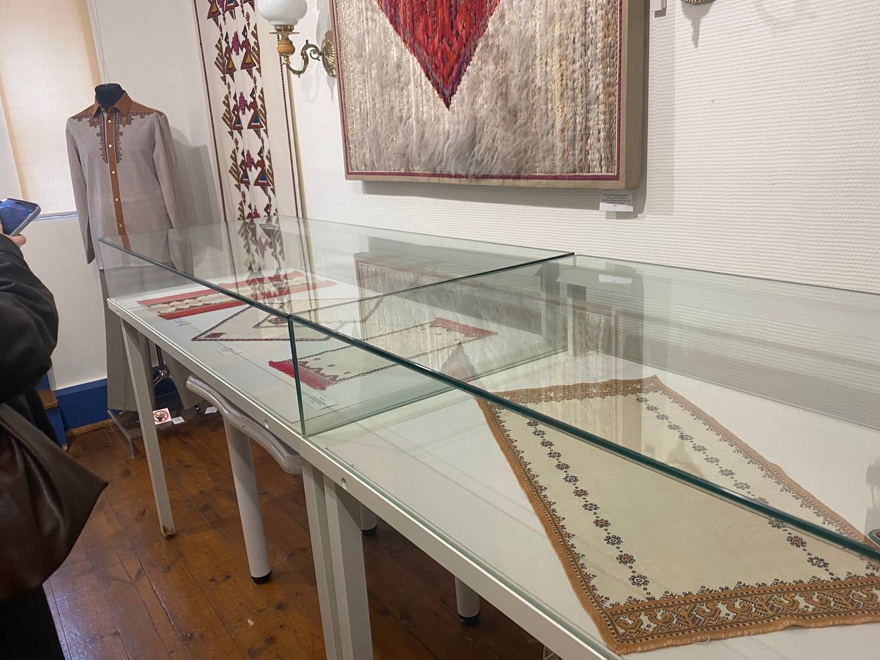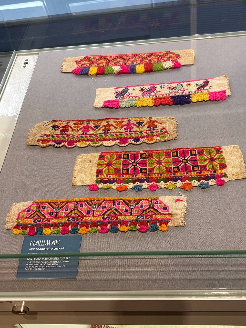 Вот вышивка, где каждый стежок словно символ. А вот величественный женский головной убор «шарпан», чьи линии говорят о зрелости и достоинстве его владелицы. Рядом расположился «нашмак», девичий головной убор, чьи узоры рассказывают о роде и красоте невесты.