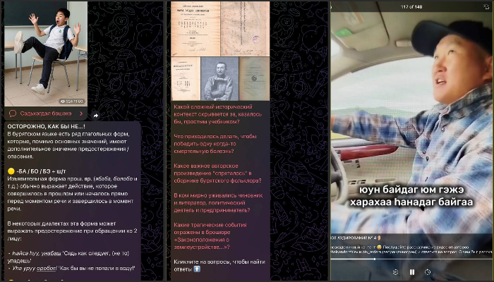 Контент создается на русском, бурятском или на обоих языках сразу. Всего было обнаружено 45 каналов, но рассмотрим всего четыре - наиболее интересных и ранжированных по числу подписчиков.