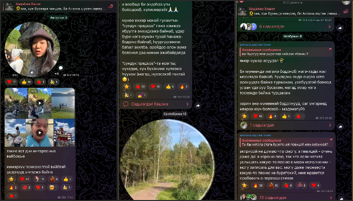 Автор канала - студентка московского вуза Алтана Будаева, которая рассказывает о своей жизни в Москве. Она пишет каждый пост сначала на русском, а в конце дублирует его на бурятском, а иногда и вовсе только на бурятском, а в комментариях оставляет перевод на русский.